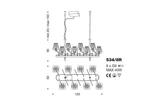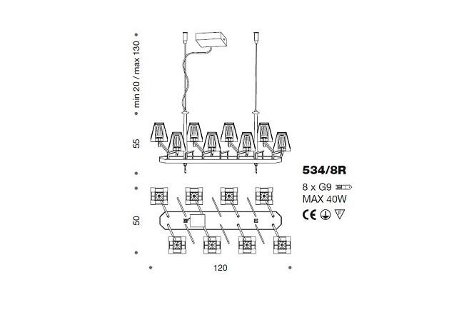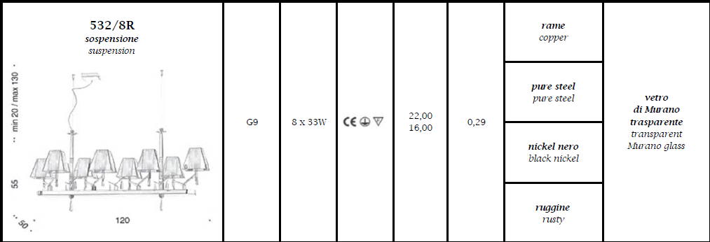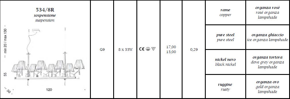Lampa wisząca, żyrandol PRESTIGE 532/8R, 534/8R - lampa o klasycznym kształcie w nowoczesnej odsłonie; rama wykonana z metalu; lampa dostępna w dwóch wykończeniach: model 532 - klosze połączenie metalu i szkła; model 534 - klosze połączenie metalu i organzy; efektowna i niepowtarzalna dostępna w kilku wariantach kolorystycznych; specyfikacja produktu poniżej; oryginalny produkt włoski.